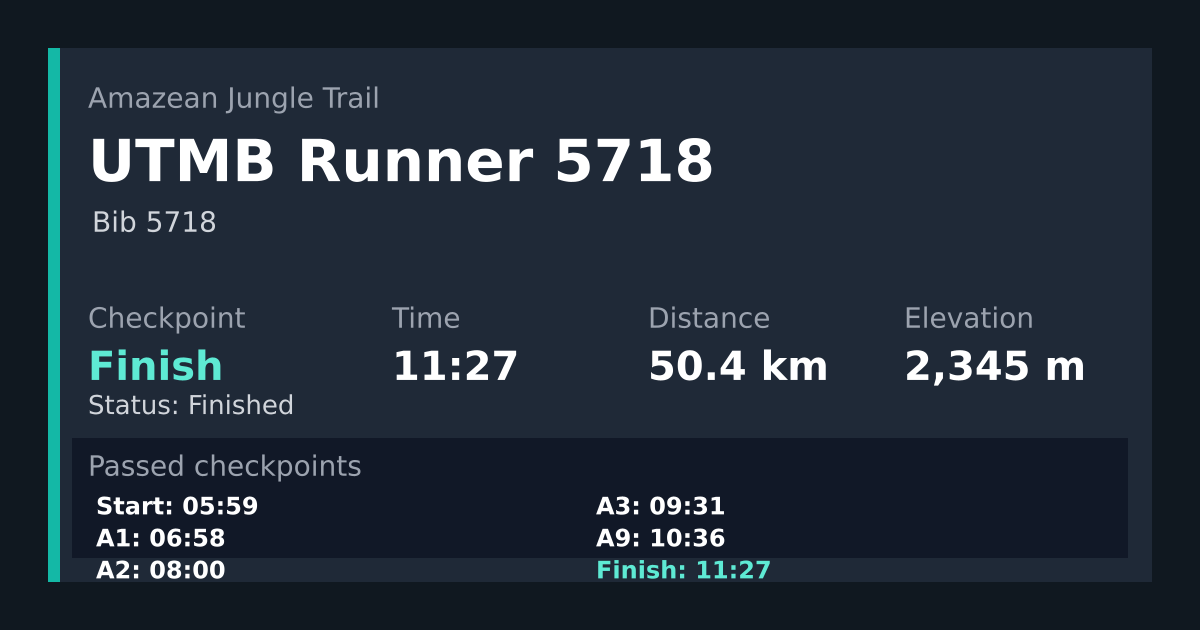 Live Race Dashboard UTMB Amazean Jungle Trail 2025 Sync nowRunner UTMB Runner 5718 Bib 5718 Current Checkpoint Finish 03 May 04:27 Status Finished Last Update 09:55 Local timeCheckpoint Timeline 1 savedFinish 03 May 2025 04:27 LINE: pending Open image